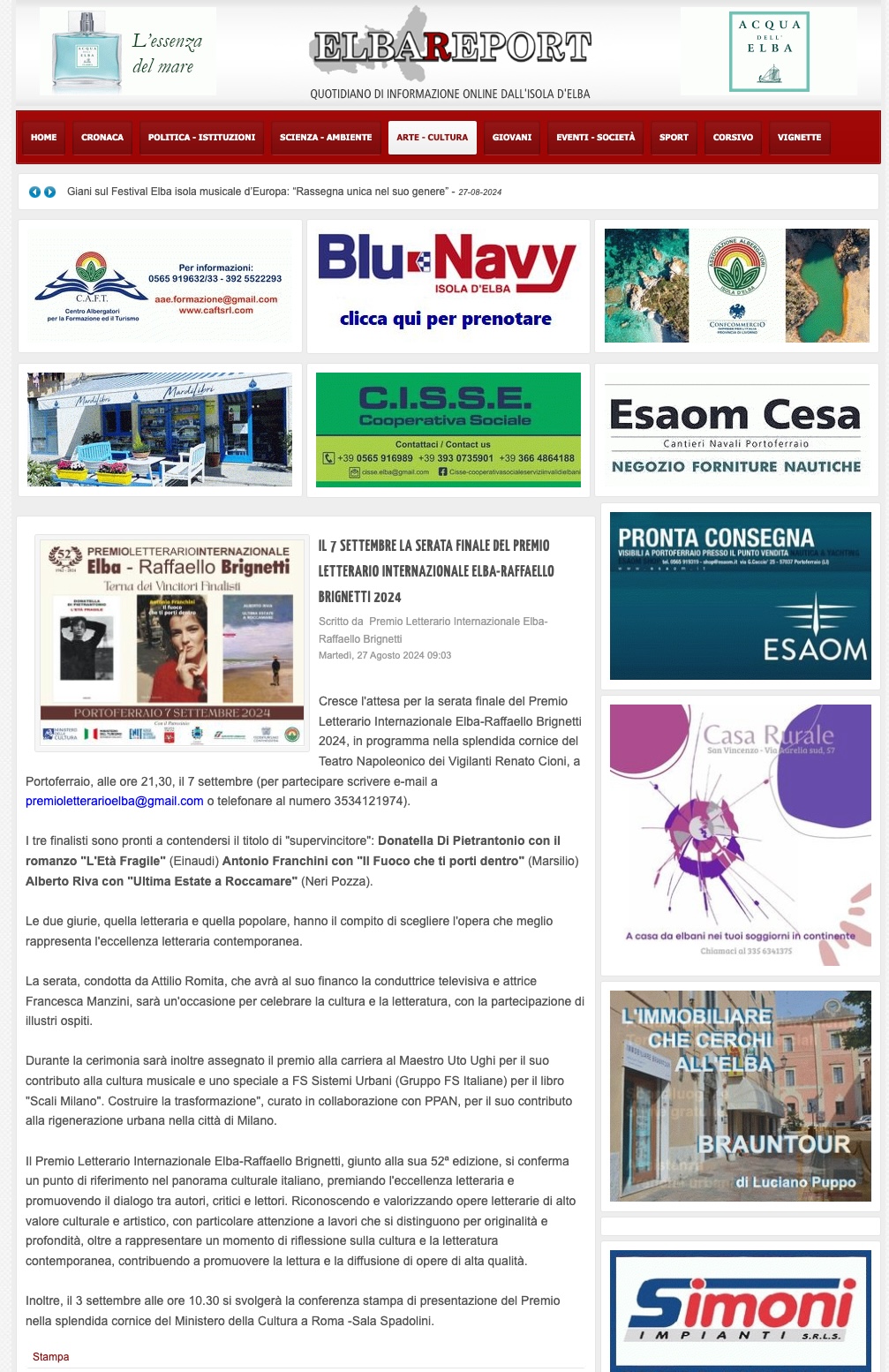 Rassegna stampa 26/08/2426 Agosto 2024Il 7 settembre la serata finale del Premio Letterario Internazionale Elba-Raffaello Brignetti 202427 Agosto 2024 Vedi tutto Rassegna stampa 27/08/24 Rai Cultura - Premio Letterario Internazionale Elba-Raffaello Brignetti 2024 VIVI ROMA - Il Premio Letterario Internazionale Elba-Raffaello Brignetti verso il gran finale INFORMATUTTO - Il Premio Letterario Internazionale Elba - Raffaello Brignetti 2024 Elbareport - Il 7 settembre la serata finale del Premio Letterario Internazionale Elba-Raffaello Brignetti 2024 ELBAPress - Tutto pronto per il Premio Letterario Isola d’Elba TIRRENO ELBA NEWS - Il Premio Letterario Internazionale Elba-Raffaello Brignetti verso il gran finale
