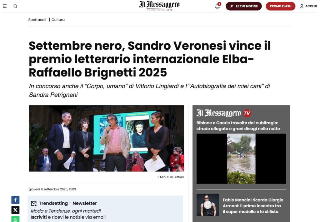 TGR Rai Toscana racconta il Premio Letterario Raffaello Brignetti 202510 Settembre 2025Rassegna stampa 29/09/202529 Settembre 2025 Vedi tutto Rassegna stampa 11/09/2025 ParlamentoNews – Sandro Veronesi è il Supervincitore del Premio Letterario Internazionale Elba-Raffaello Brignetti 2025 Il Messaggero – Settembre nero, Sandro Veronesi vince il premio letterario internazionale Elba-Raffaello Brignetti 2025